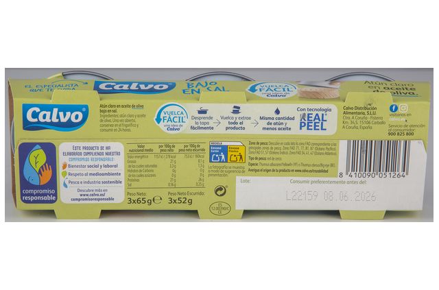 ATUN CLARO EN ACEITE OLIVA BAJO EN SAL CALVO 3X 65G cantidad